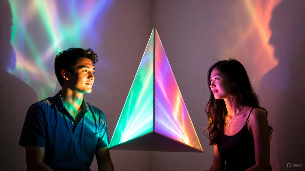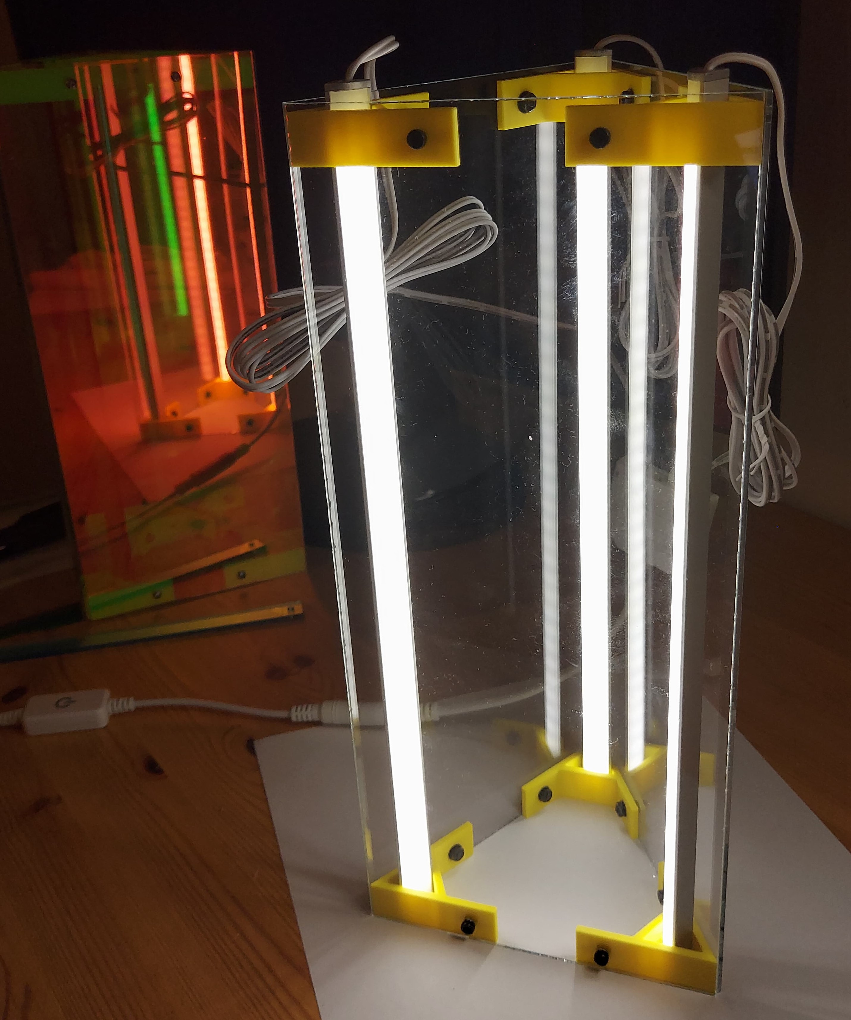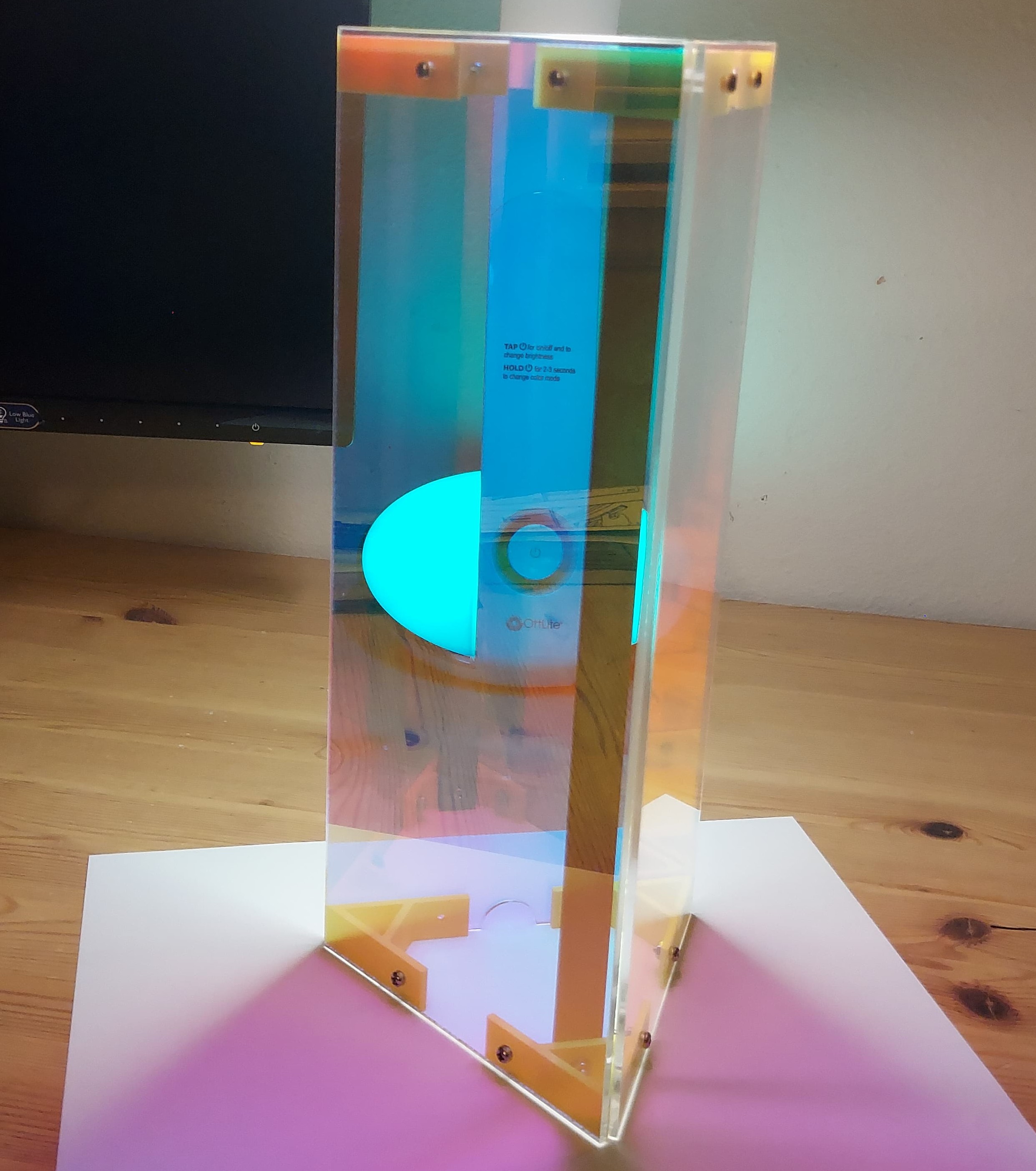 Context: This project explores how physical structure, material properties, and controlled lighting can create a dynamic, angle-dependent color experience. The design began with the idea of a monolithic triangular lamp made of three 30 cm × 13 cm tinted acrylic panels. The goal was to build an elegant display piece where the color shifts from blue → purple → pink depending on the viewer’s angle.